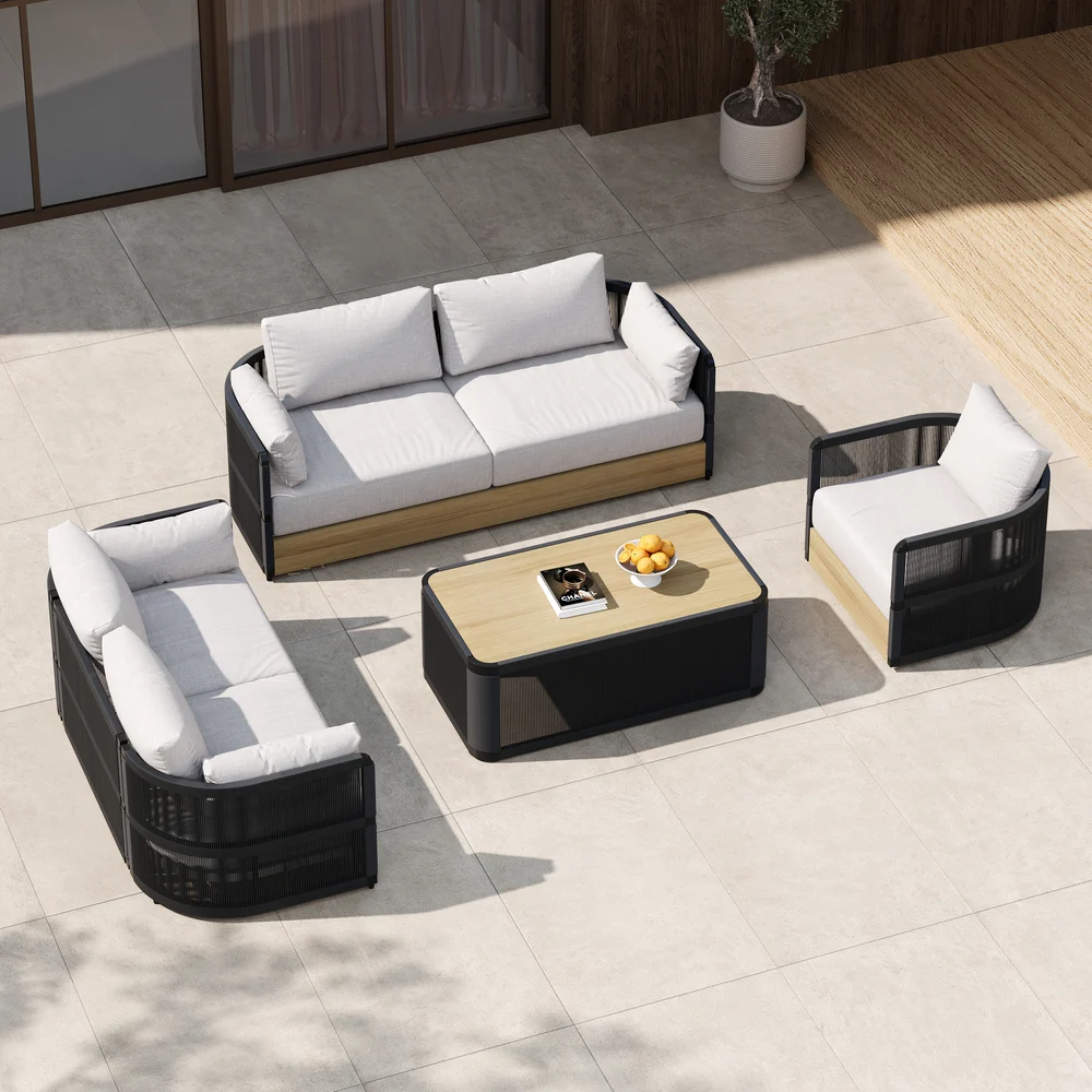 4 PCS Modern Aluminum & Rope Outdoor Swivel Sofa Set with Coffee Table