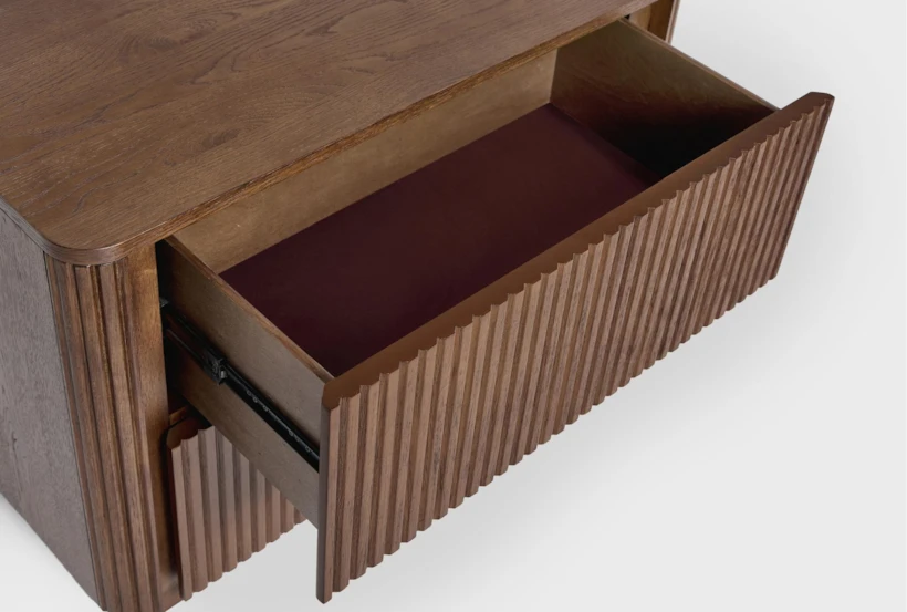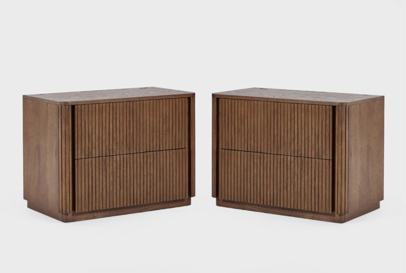 Upgrade your bedroom with the Kissa Reeded 2-Drawer Nightstand Set by Living Spaces. This set of two nightstands combines modern design with practical functionality, featuring a textured reeded front, two spacious drawers, and a built-in USB port for convenient device charging. Finished in warm brown wood, these nightstands complement a variety of bedroom décor styles, from contemporary to transitional.