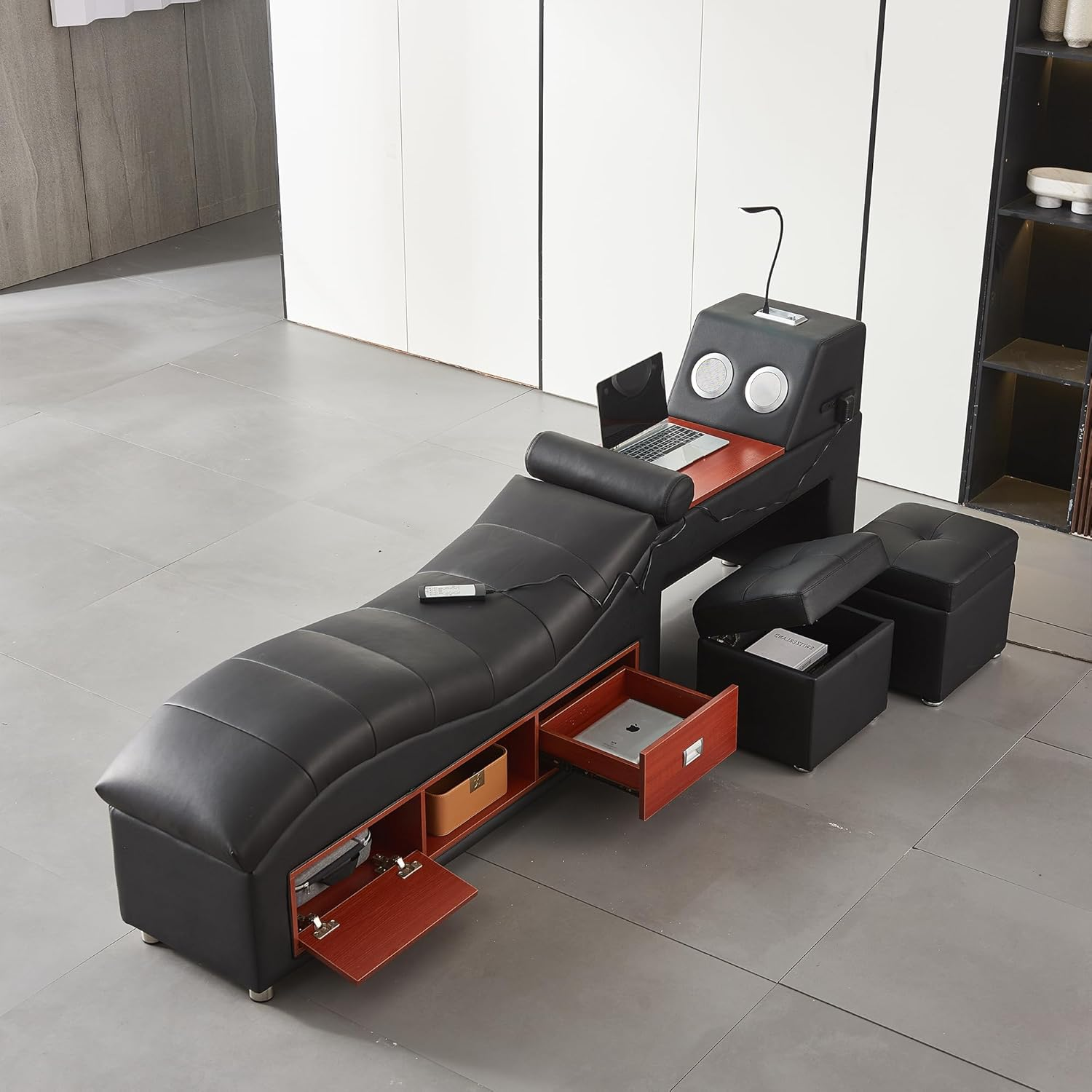 Upgrade your bedroom with the Multifunction Smart King Bed Frame, designed to combine modern luxury with advanced comfort technology. This upholstered platform bed features an integrated massage recliner system, offering adjustable positioning and soothing vibration settings to help you unwind after a long day. The sleek, contemporary silhouette and premium upholstery create a refined focal point while delivering next-level relaxation.